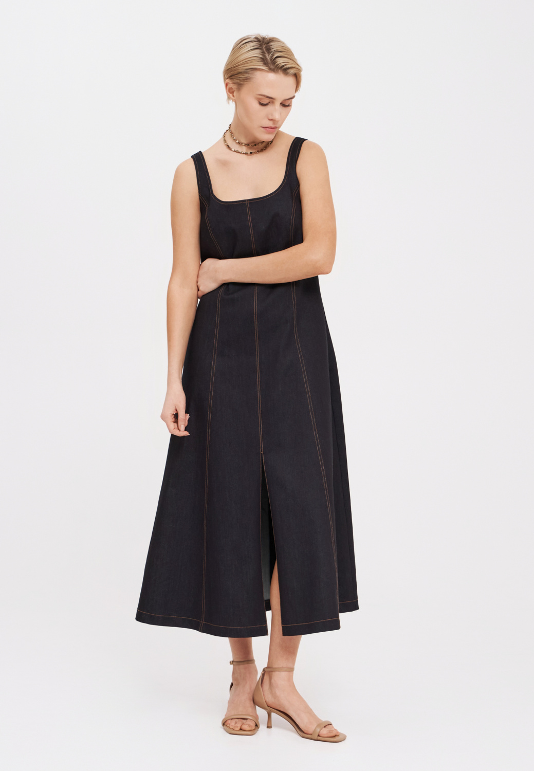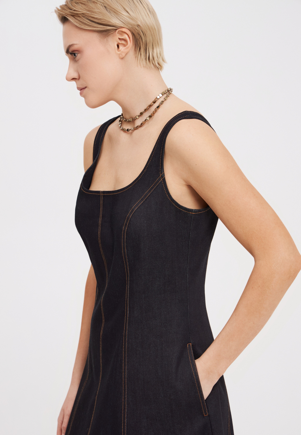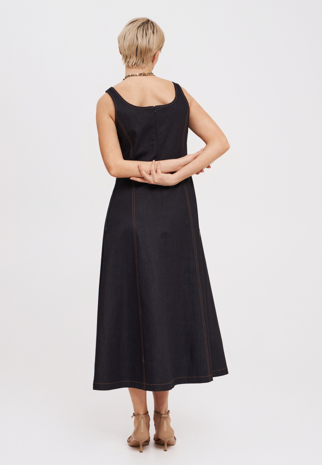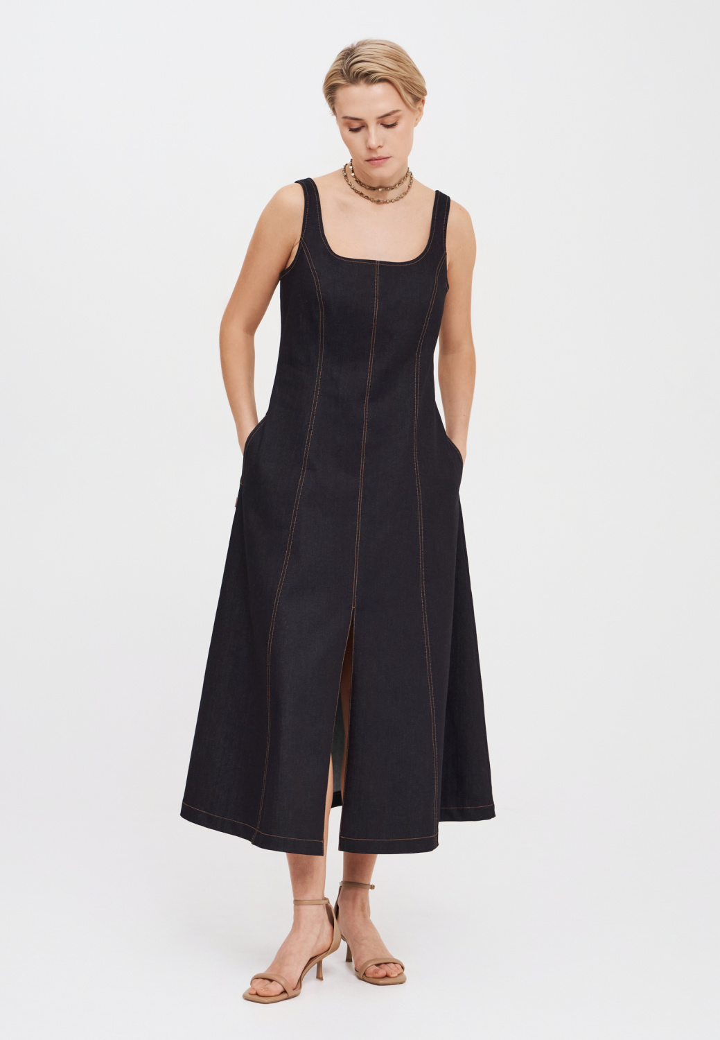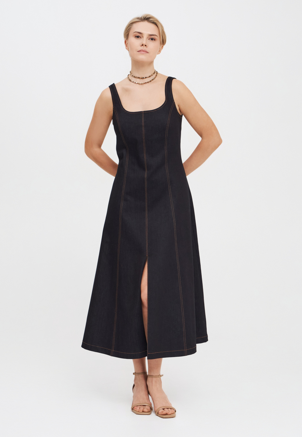 Удобный сарафан из джинсы лаконичного стиля. Безупречная посадка. Элегантный глубокий круглый вырез, полуприлегающий силуэт и высокий разрез спереди визуально вытягивают фигуру.