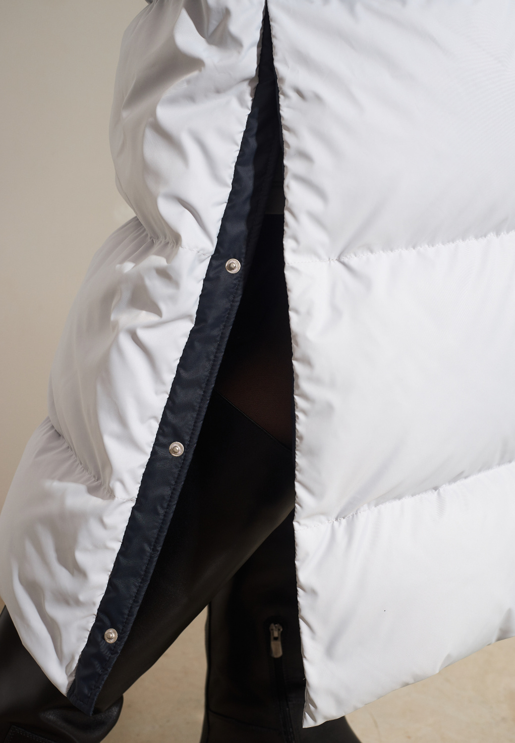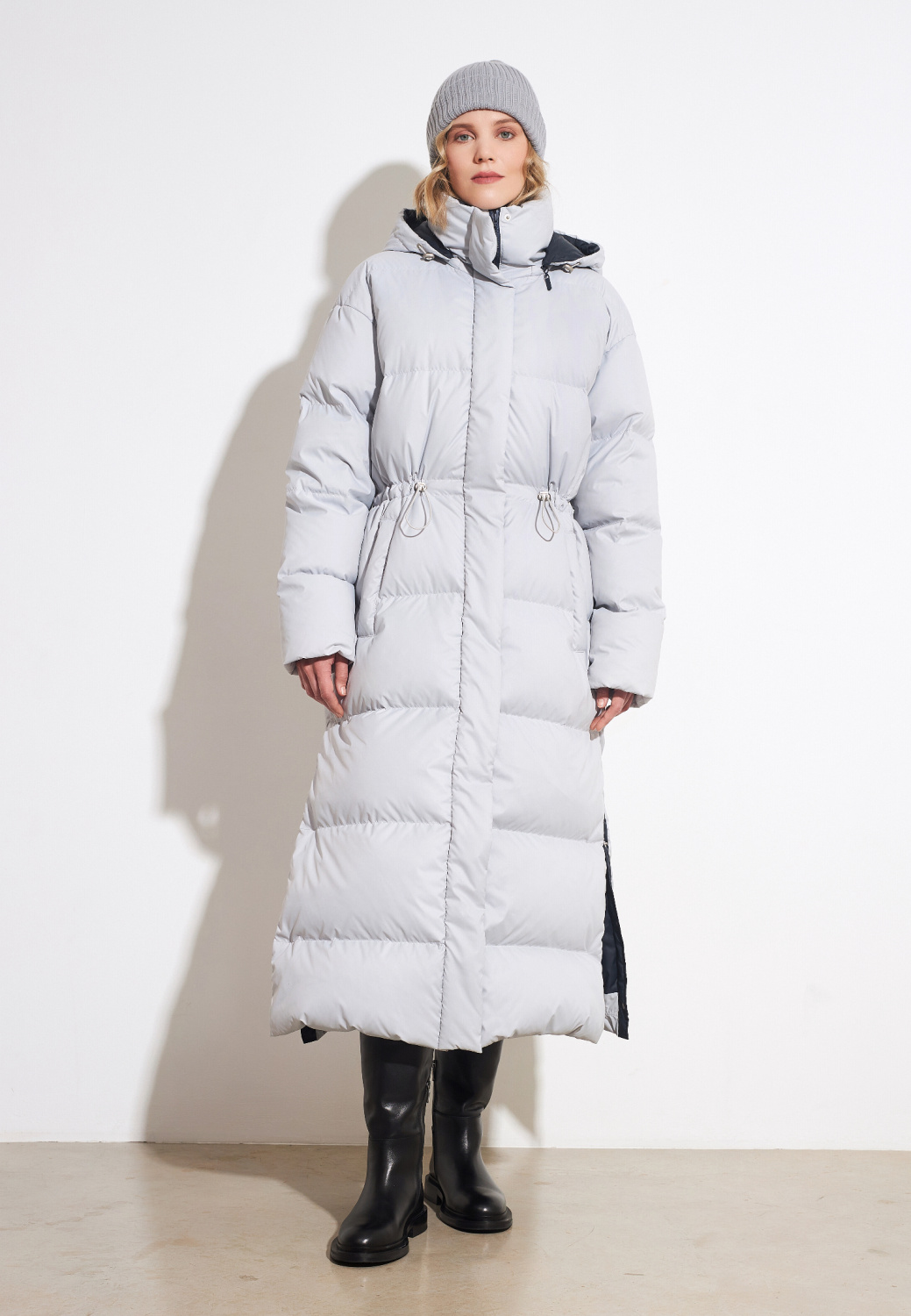 Длинный женский пуховик с горизонтальной стёжкой - базовая вещь в зимнем гардеробе. Контрастная внутренняя отделка делает изделие практичным в носке. Воротник стойка надежно закрывает шею, а кулиса на талии позволяет варьировать силуэт от прямого до более женственного. Пуховик имеет натуральный наполнитель из гусиного пуха, распределенного в специальные пакеты, защищающие наполнитель от миграции.